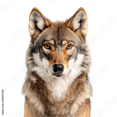 © ruangrit19, Fototapeta premium Majestic Wolf Portrait on White Background Captivating Wilderness Predator Close up