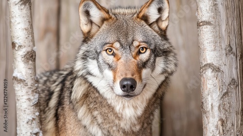 © BROPRADANA, Obraz premium Majestic wolf portrait, winter enclosure, birch trees, wildlife