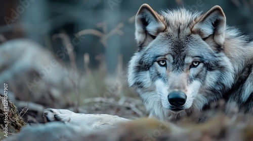 Fototapeta premium Majestic wolf resting in a natural setting showcasing its intense gaze and...
