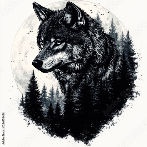 Fototapeta premium Majestic Wolf Silhouette Surrounded by Forest and Full Moon in Artistic Black and White Illustration