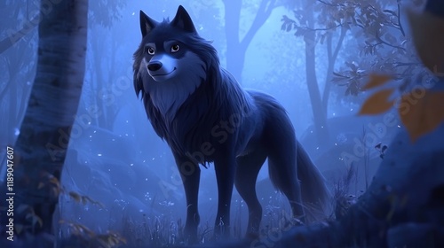 © milenialdesastudio, Obraz premium Majestic wolf standing in a mystical, moonlit forest.
