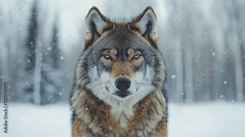 Naklejka premium Majestic wolf standing in snow, showcasing its powerful presence and striking features amidst serene winter landscape