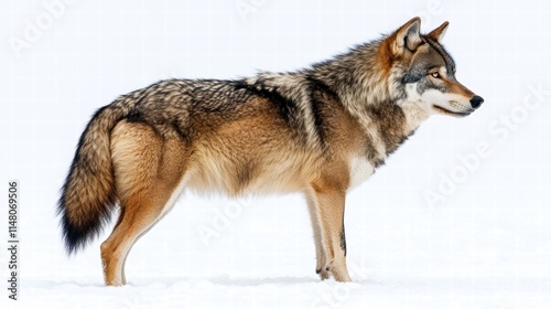 Naklejka premium Majestic Wolf Standing in Snowy Landscape, Showcasing Natural Elegance and Poise in a Winter Wonderland, Captured in Stunning Detail