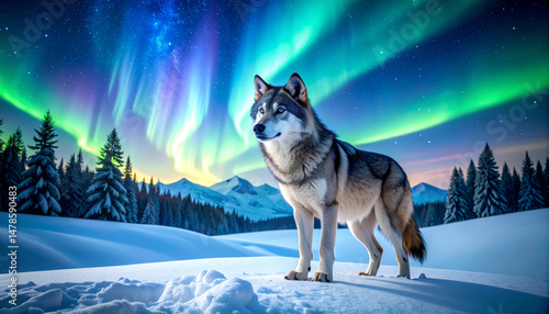 © mingnimit, Naklejka premium Majestic wolf standing in snowy landscape under vibrant northern lights, showcasing piercing blue eyes and strong presence. serene atmosphere evokes sense of wonder and beauty