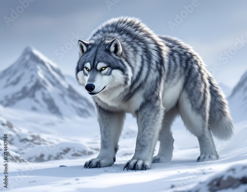 © Day, Obraz premium Majestic Wolf Standing in Snowy Landscape with Mountain Backdrop in Daylight