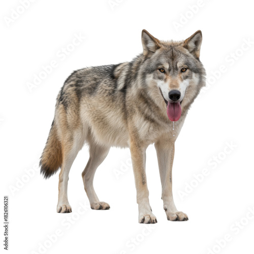 © Gustav, Fototapeta premium Majestic wolf standing on a black background with its tongue out and looking at the camera