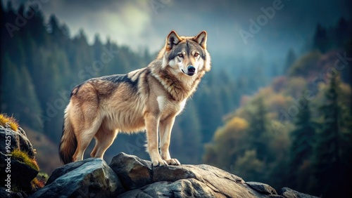 Fototapeta premium Majestic wolf standing strong on rocky terrain in the wilderness, wolf,...