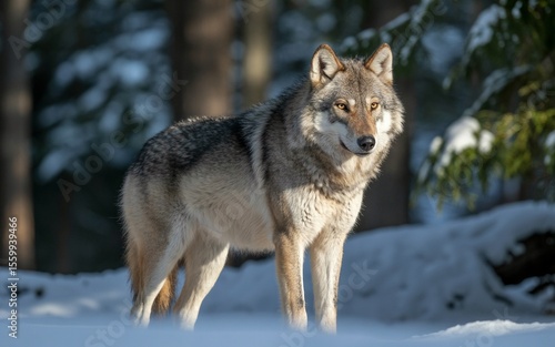 Fototapeta premium Majestic Wolf Stands Proudly in Winter Forest, Illuminated by Sunlight,...