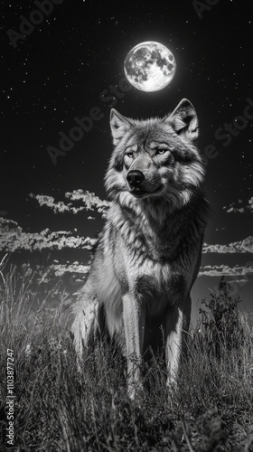 Fototapeta premium Majestic Wolf Under a Full Moon Illuminating a Starry Night Sky in Black and...