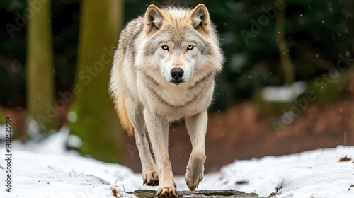 Fototapeta premium Majestic Wolf Walking Through Snowy Forest Landscape in Winter