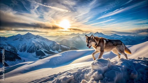 Fototapeta premium Majestic Wolfdog Soaring Above Snowy Peaks: Breathtaking Aerial View