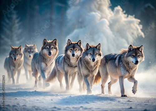 © Four888, Naklejka premium Majestic Wolves in a Snowy Mist A Captivating Wildlife Photograph of Elegant Canines in a Winter Wonderland