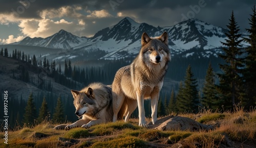 © Василь Тігай, Obraz premium Majestic Wolves in Mountain Landscape