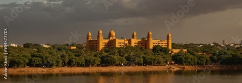 Naklejka premium Majestic Yellow Building on the Riverbank.