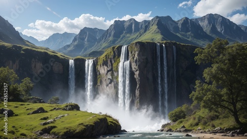 Fototapeta premium Majestic Yosemite waterfall cascades down granite rocks in a lush green...