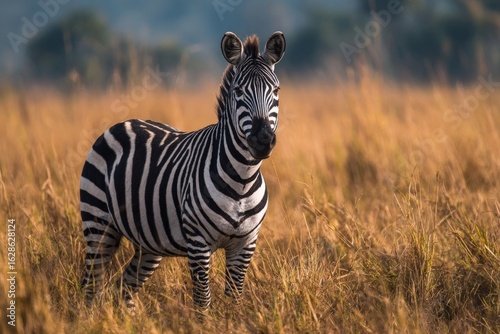 Naklejka premium Majestic zebra grazing in the golden grasslands of Africa during a tranquil afternoon