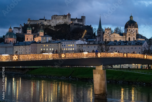Fototapeta premium Makartsteg (love lock padlock bridge) over the Salzach River, with the fortress in background. Salzburg cityscape at night