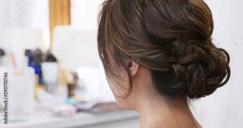 © leungchopan, Fototapeta premium Make up artist make a hairstyle for bride in salon