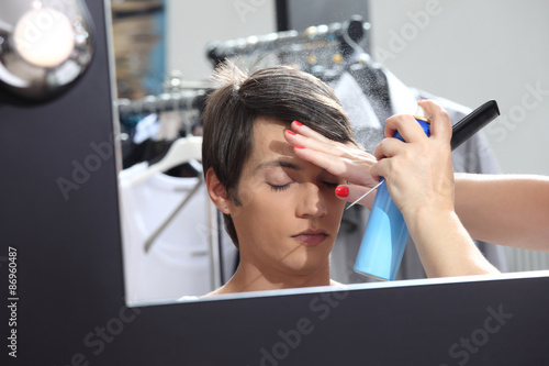 © amedeoemaja, Fototapeta premium make up model at mirror in dressing room, sprays hairspray