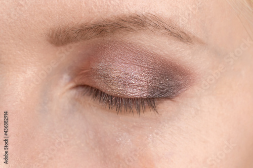 Fototapeta premium Make-up of the eyes of a young woman in brown and pink tones close-up. Next stage