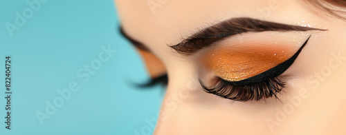 © SnowElf, Fototapeta premium Makeup aesthetic, perfect black eye liner, false eyelashes, straight arrows on the eyelids, minimalist make-up on colored background