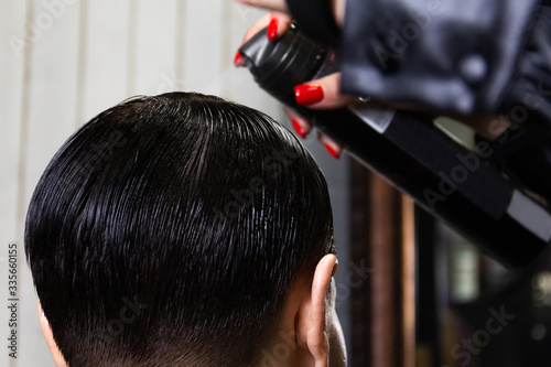 Fototapeta premium Makeup artist does hairstyle to a girl with beautiful black short hair. Beauty and fashion industry. Gel polish for hair. Shine and glow