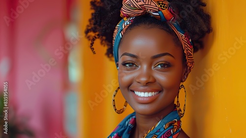 © Wiseman, Fototapeta premium makeup beauty and scarf with smile and black woman in studio for creative art and culture fashion cosmetics and natural with face of model isolated on pink background for african .hight relustion