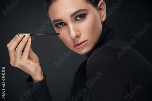 Obraz premium Makeup Cosmetics. Woman With Beauty Face Applying Black Mascara