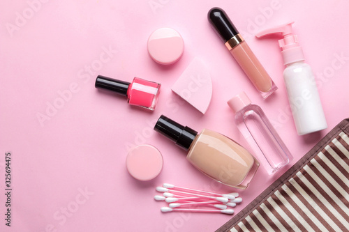 Obraz premium makeup kit. Women's cosmetics in a cosmetic bag and makeup brushes on a pink bright background. women things. top view