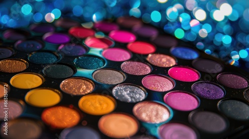 © Kittipong, Naklejka premium Makeup palette with vibrant colors displayed, set against a stunning macro backdrop