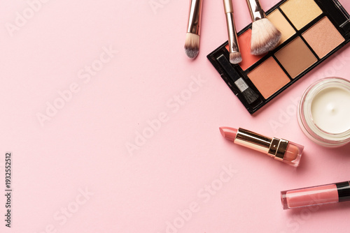 Fototapeta premium Makeup products flat lay background on pink.