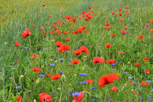 © W Korczewski, Fototapeta premium Maki i chabry wśród zielonego zboża na polu w pochmurny dzień.