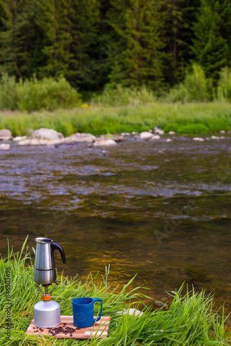 © Bondariev Volodymyr., Fototapeta premium Making coffee on a burner while hiking.