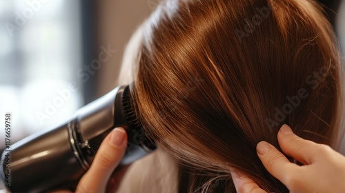 © OLEKSANDR, Fototapeta premium Making hairstyle using hair dryer