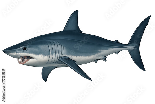 © PNG Kingdom , Naklejka premium Mako shark swimming, fierce ocean predator, marine animal illustration with open mouth and sharp teeth on transparent background