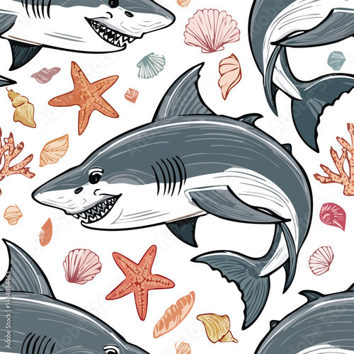 © cloud7days, Obraz premium Mako Shark Vector Illustration with Seamless Pattern Design