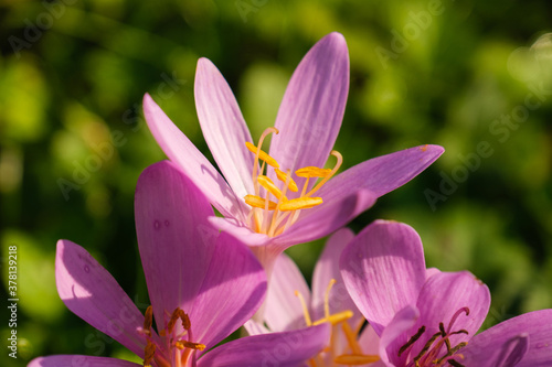 Naklejka premium Makro / Detail der Blüte einer Herbstzeitlose (lat.: Colchicum autumnale), einer giftigen Wildblume, die im Spätsommer / Herbst blüht