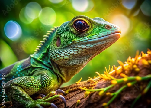 Obraz premium Makrofotografia zielonej jaszczurki na drzewie z żywymi szczegółami i...