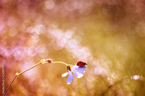 Naklejka premium Mała czerwona biedronka chodzi wokół rośliny w poszukiwaniu mszyc.