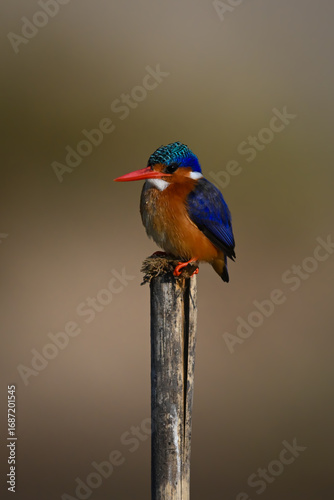 © Nick Dale, Fototapeta premium Malachite kingfisher watching camera from wood post