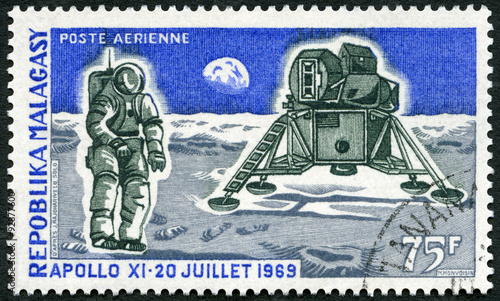 © Popova Olga, Fototapeta premium MALAGASY - 1969: Apollo 11 Lunar Landing Module and Man on Moon