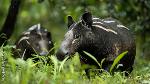 © Jan, Fototapeta premium Malayan tapir and her striped calf among green leaves.