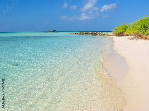 Obraz premium Maldives background, Atoll, Indian Ocean. Palm trees on the white sand beach. Turquoise water of the lagoon. Asdu in Male North.