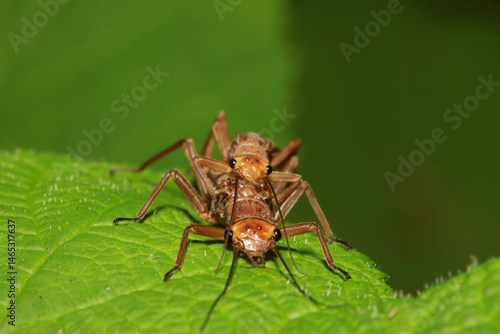 Fototapeta premium Male and female adult stoneflies (Hesperoperla pacifica), mating on a leaf beside a trout stream, macro close-up, face-on view.