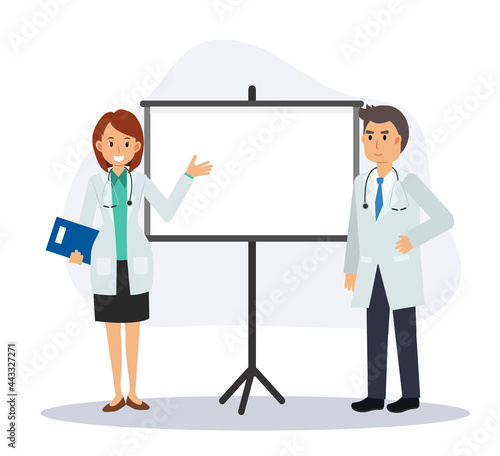 © Thidarat, Obraz premium male and female doctors are giving presentation. Flat vector cartoon character illustration.