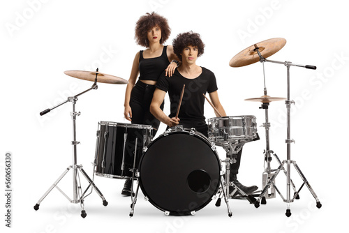 © Ljupco Smokovski, Fototapeta premium Male and female drummers posing with a drum kit