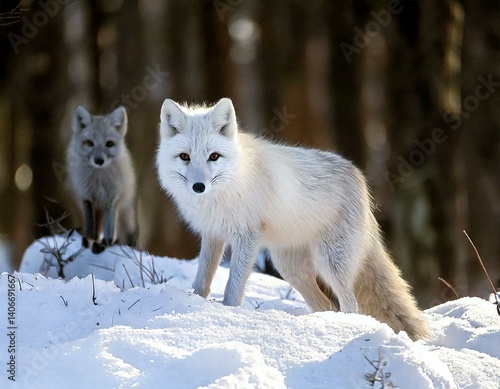 © kobitaart38, Naklejka premium "Male and Female Foxes Gracefully Roaming the Snowy Woods: A Winter's Tale of Nature"