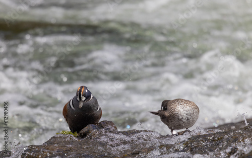Fototapeta premium Male and Female Harlequin Ducks in the Yellowstone River