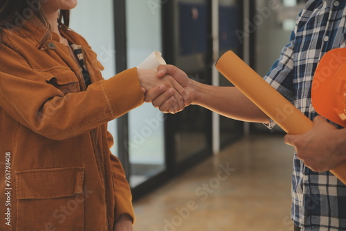 © Sirikarn Rinruesee, Obraz premium Male and Female Industrial Engineers in Hard Hats Discuss New Project while Using Laptop. They Make Showing Gestures.They Work in a Heavy Industry Manufacturing Factory.