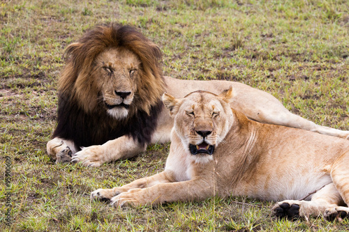 © JHVEPhoto, Naklejka premium Male and female lion pair lying on green grass, Masai Mara Reserve, Kenya, Africa